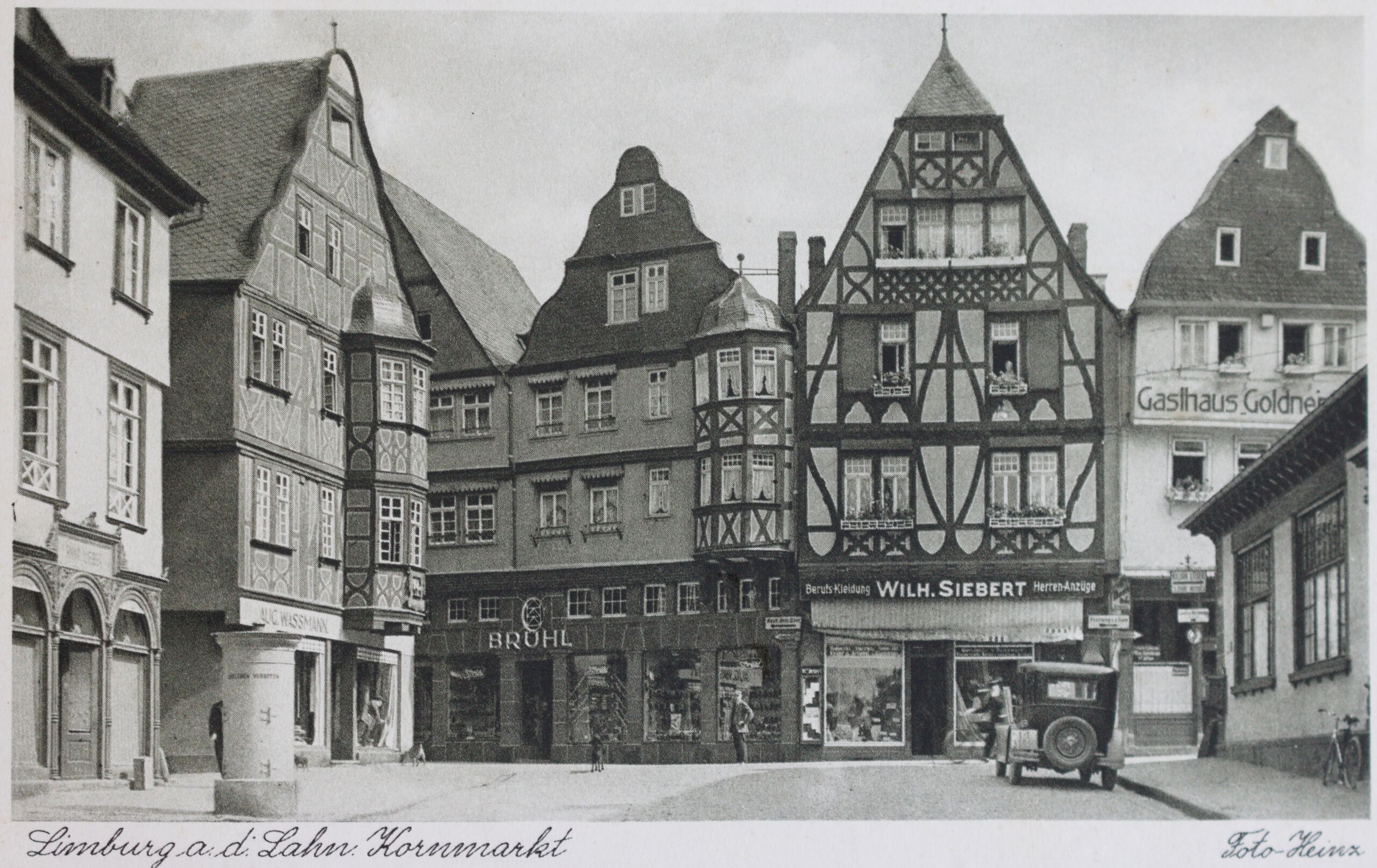 Aufnahme des Kornmarkts in Limburg, aus Richtung Süden fotografiert, auf einer 1930 gelaufenen Postkarte